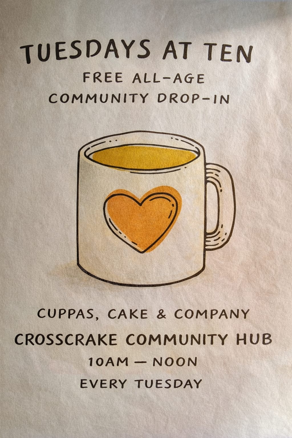 Crosscrake Community Hub welcomes all ages to come along for a cuppa and a chat at our regular community drop-in every Tuesday at 10 am to 12 noon. A very warm welcome awaits!